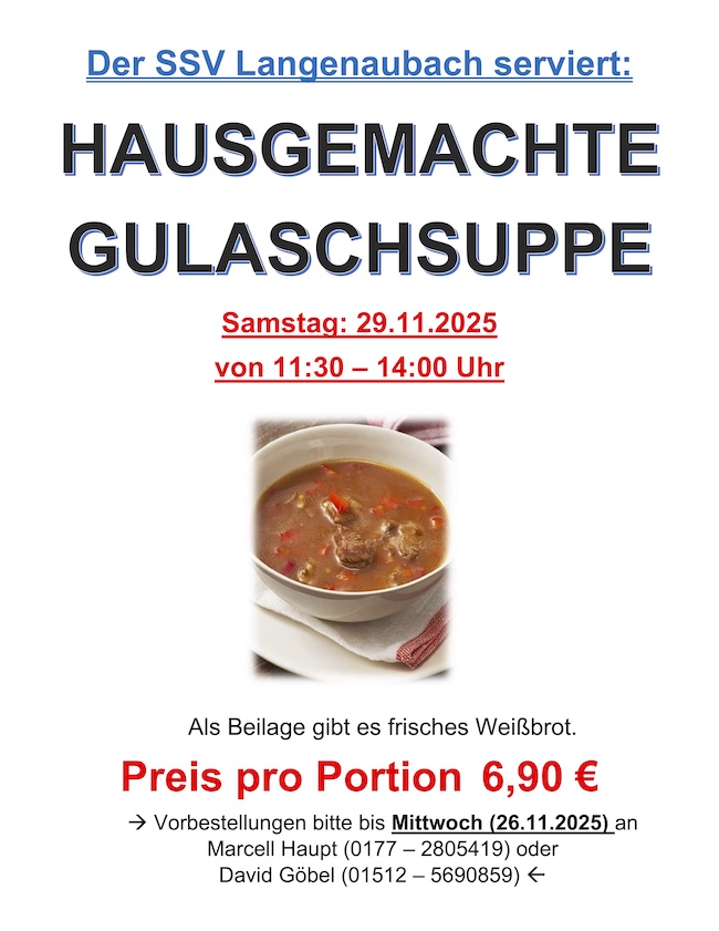Der SSV Langenaubach lädt auch in diesem Herbst noch einmal herzlich zum traditionellen Gulaschsuppen-Essen ein. Am Samstag, den 29. November 2025, dürfen sich alle Besucherinnen und Besucher zwischen 11:30 und 14:00 Uhr auf eine frisch zubereitete, hausgemachte Gulaschsuppe freuen. Serviert wird die kräftige Suppe wie gewohnt mit Weißbrot – perfekt für die kalten Spätherbsttage.Eine Portion kostet 6,90 €. Die Suppe kann gemütlich im Sportheim verzehrt oder auf Wunsch auch mitgenommen werden. Für den Außer-Haus-Verkauf bittet der SSV darum, geeignete Behältnisse mitzubringen. Um die Planung zu erleichtern, werden Vorbestellungen bis zum 26.11.2025 entgegengenommen. Bestellungen können direkt bei David Göbel (01512 – 5690859) oder Marcell Haupt (0177- 2805419) aufgegeben werden.