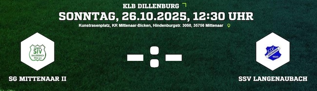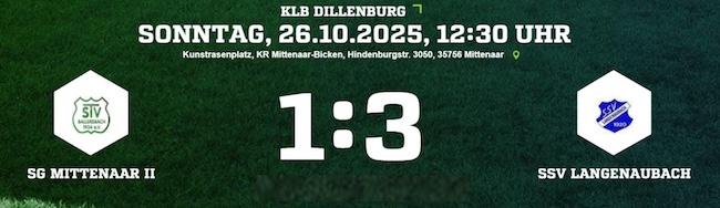 Am Sonntag (26.10.2025) empfängt die SG Mittenaar II den favorisierten SSV Langenaubach zum Duell auf dem Kunstrasen in Bicken. Die Rollen vor der Partie scheinen klar verteilt: Während die Gastgeber aktuell mit 11 Punkten aus 11 Spielen auf Tabellenplatz 15 rangieren, hat der SSV nach dem Last-Minute-Sieg am vergangenen Wochenende seine starke Form bestätigt und Platz 3 in der B-Liga weiter gefestigt. Für die SG Mittenaar II verlief die bisherige Saison wechselhaft. Mit drei Siegen und zwei Unentschieden aus elf Begegnungen steckt das Team im unteren Tabellendrittel fest und braucht dringend Punkte, um nicht tiefer in den Abstiegskampf zu rutschen. Der SSV Langenaubach reist dagegen mit viel Selbstvertrauen an. Nach zuletzt überzeugenden Auftritten und dem jüngsten Erfolg in der Schlussphase geht das Team von Trainerduo Thorsten Stapel und Timo Strassen mit breiter Brust in die Partie. Ein weiterer Sieg würde den Anschluss an die Spitzenplätze festigen und die gute Ausgangslage im Aufstiegsrennen weiter verbessern. Anstoß der Partie ist bereits um 12:30 Uhr