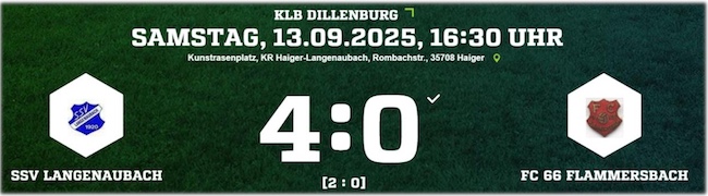 Am Sonntag (07.09.2025) konnte der SSV erneut drei Punkte auf der Habenseite für sich verbuchen. Auf der Kalteiche gelang dem Team von Trainerduo Thorsten Stapel & Timo Strassen ein 4:0 Erfolg. Im ersten Durchgang dauerte es bis zur Nachspielzeit, ehe Dominik Hain die 1:0 Führung für Langenaubach erzielen konnte. Nach dem Seitenwechsel legte Dominik Hain in der 49. Minute das 2:0 nach, ehe SSV-Stürmer David Nasaruk in der 70. Minute endgültig die Weichen auf Sieg stellte. Den Schlusspunkt in der Partie setzte dann Taygun Turp (90+1) und markierte mit seinem Treffer den 4:0 Endstand für den SSV Langenaubach. Mit dem Sieg kletterte der SSV nun auf Tabellenplatz vier.