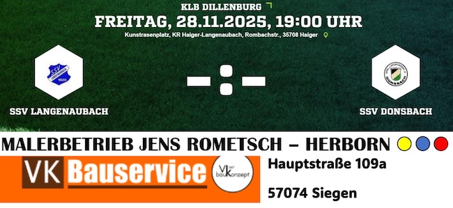 Am kommenden Freitagabend (28.11.2025) steht in der B-Liga ein echtes Derby auf dem Programm, wenn der SSV Langenaubach den SSV Donsbach auf dem heimischen Kunstrasen empfängt. Beide Mannschaften mussten am vergangenen Wochenende aufgrund der widrigen Witterungsbedingungen eine unfreiwillige Pause einlegen - umso größer ist nun die Vorfreude auf das Flutlichtduell. Die tabellarischen Voraussetzungen könnten dabei unterschiedlicher kaum sein: Die Gäste aus Donsbach rangieren aktuell mit 16 Punkten auf Platz 10, wollen jedoch gerade in einem Derby mit Kampfgeist und Leidenschaft überzeugen. Für die Hausherren aus Langenaubach geht es dagegen um deutlich mehr. Mit 34 Punkten liegt das Team des Trainerduos Thorsten Stapel & Timo Strassen fest auf Platz 2, dem Relegationsrang zum möglichen Aufstieg in die A-Liga. Ein Sieg würde Langenaubach in der starken Verfolgerrolle weiter festigen. Das Team zeigte in den vergangenen Wochen konstant gute Leistungen und möchte nach der wetterbedingten Unterbrechung nahtlos daran anknüpfen. Besonders die Heimstärke (bisher nur eine Niederlage) auf dem Kunstrasen soll erneut zum Trumpf werden. Der SSV Donsbach hingegen reist als Außenseiter an, hofft aber darauf, die Pause zur Regeneration genutzt zu haben, um so für eine Überraschung zu sorgen. Alles ist angerichtet für einen spannenden Derbyabend unter Flutlicht. Die Zuschauer dürfen sich auf ein interessantes Duell zweier Teams freuen, die aus unterschiedlichen Gründen unbedingt Punkte benötigen - der eine, um oben dranzubleiben, der andere, um sich im Tabellenmittelfeld Luft zu verschaffen. Anstoß der Partie ist um 19:00 Uhr.
