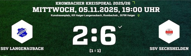 Am Mittwoch, den 05. November 2025, kommt es um 19:00 Uhr auf dem Kunstrasenplatz in Langenaubach zum spannenden Duell im Kreispokal zwischen dem SSV Langenaubach und dem SSV Sechshelden. Die Gastgeber aus Langenaubach gehen als Außenseiter in die Partie gegen das höherklassige Kreisoberliga-Team aus Sechshelden. Dennoch will die Mannschaft des Trainerduos Thorsten Stapel und Timo Strassen ihre derzeit gute Form bestätigen. In der Liga blieb der SSV Langenaubach zuletzt vier Spiele in Folge ungeschlagen und hat sich dabei in starker Verfassung präsentiert. Die Gäste aus Sechshelden hingegen mussten in den vergangenen Wochen einige Rückschlag hinnehmen: Gegen die SG Seelbach/Scheld setzte es zuletzt eine 1:3-Heimniederlage. Entsprechend werden sie im Pokalduell auf Wiedergutmachung aus sein. Trotz der klaren Rollenverteilung hofft die Heimelf auf eine Überraschung – denn wie man weiß, hat der Pokal seine eigenen Gesetze. Mit Einsatz, Leidenschaft und der Unterstützung der Zuschauer will der SSV Langenaubach dem Favoriten aus Sechshelden ein Bein stellen und den Einzug in die nächste Runde perfekt machen.