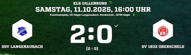 Am Samstagnachmittag, dem 11. Oktober 2025, traf der SSV Langenaubach im Heimspiel der B-Liga auf den SV Oberscheld. Bei herbstlichem Wetter und auf dem Kunstrasenplatz in Langenaubach bekamen die Zuschauer aus beiden Lagern eine engagierte und faire Partie zu sehen. Am Ende behielt der SSV mit 2:0 die Oberhand und verbuchte drei wichtige Punkte. Bereits in der ersten Hälfte stellte Langenaubach die Weichen auf Sieg. Nach einem konzentrierten Beginn gelang David Nasaruk in der 15. Spielminute die frühe Führung für die Gastgeber. Der SSV blieb auch in der Folge spielbestimmend und kam immer wieder gefährlich vor das Tor der Gäste. Kurz vor dem Halbzeitpfiff erhöhte Taygun Turp in der 41. Minute auf 2:0 – die beruhigende Pausenführung war perfekt. In der zweiten Hälfte begegneten sich beide Teams auf Augenhöhe. Der SV Oberscheld zeigte sich bemüht, fand aber nur selten eine Lücke in der gut organisierten Defensive des SSV. Die Hausherren verwalteten das Ergebnis clever und ließen kaum nennenswerte Chancen zu. Trotz einzelner Offensivaktionen auf beiden Seiten blieb es beim 2:0-Endstand.